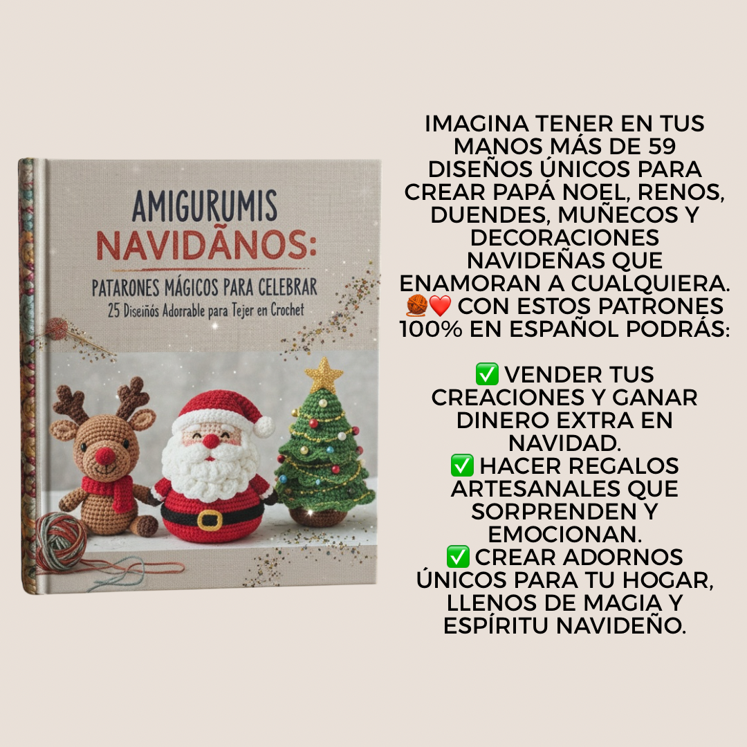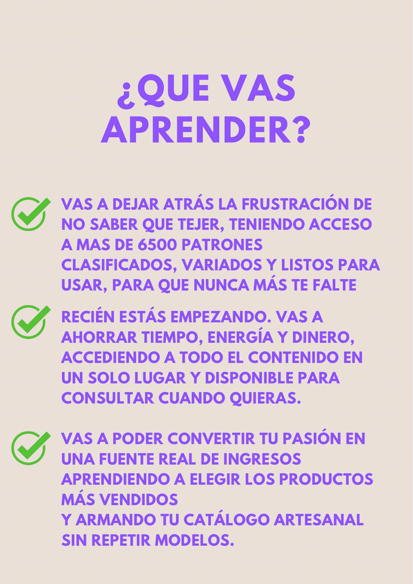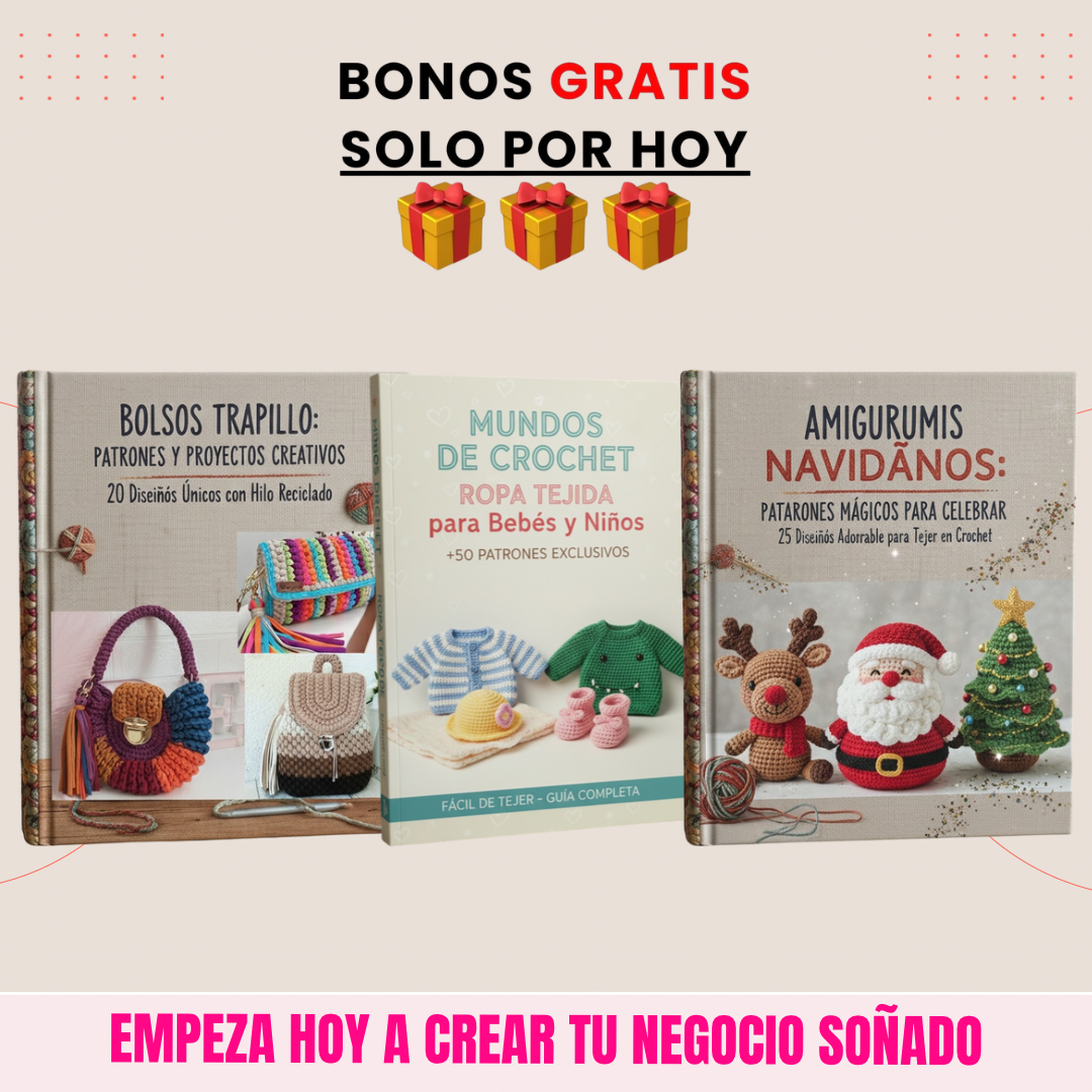 Incluye una guía completa para hacer tu primer amigurumi en 24hs, +6.000 patrones hermosos, y 3 bonos exclusivos para ayudarte a crear, organizarte y empezar a vender.